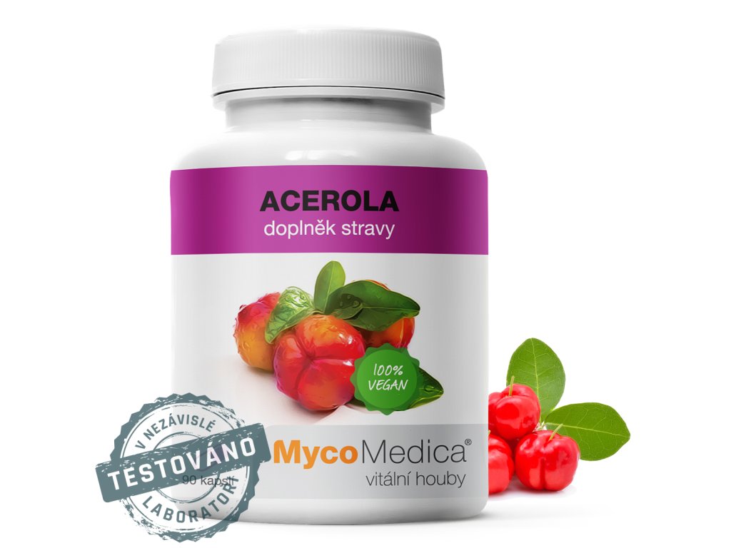 Acerola je přírodní zdroj vitamínu C, který zlepšuje vstřebatelnost bioaktivních látek vitálních hub lidským organismem.