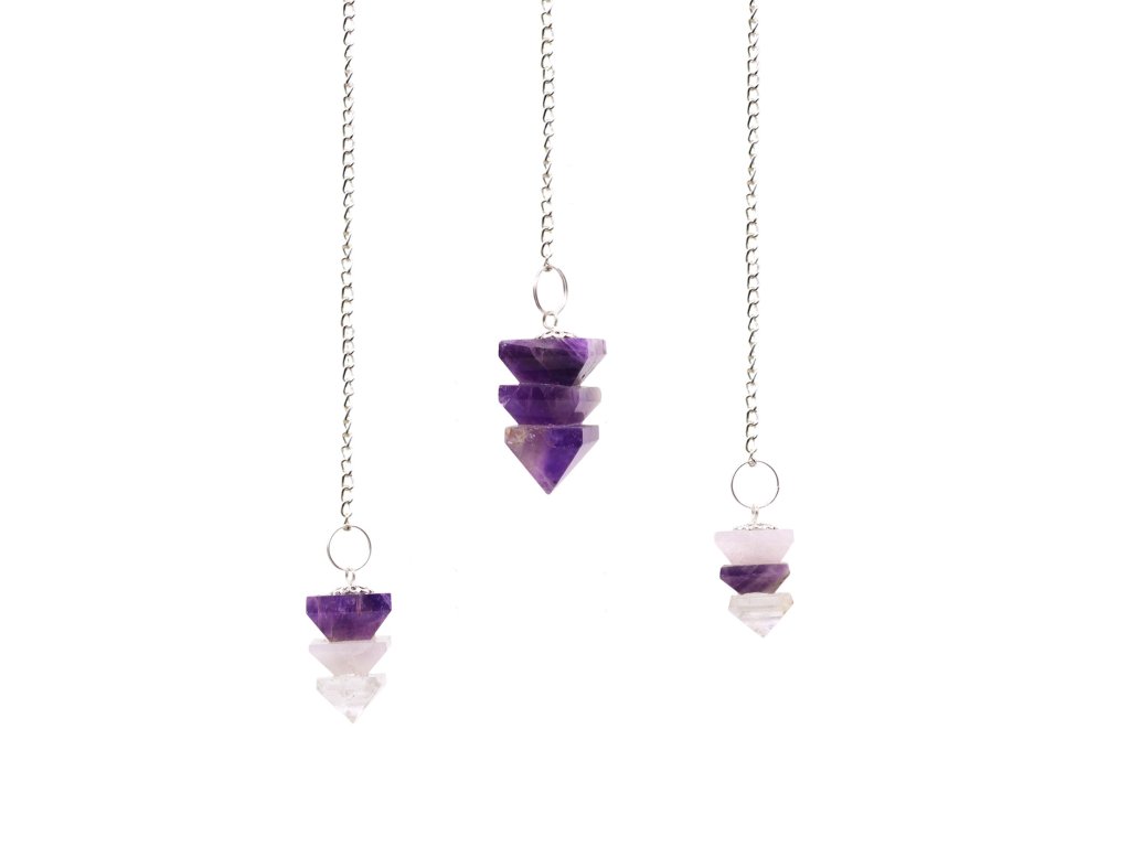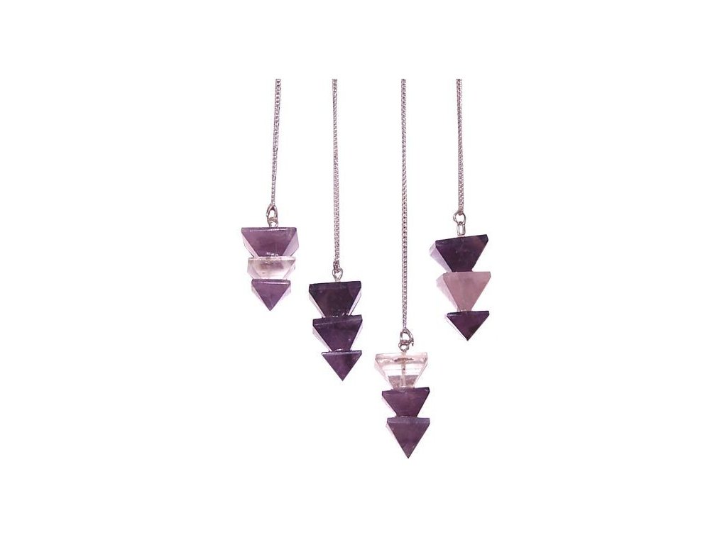 Elegantní kyvadlo z přírodních kamenů ve tvaru pyramid. Na výběr růženín, ametyst nebo harmonický mix kamenů. Každý kus je originál. Jednoduché kovové uchycení a řetízek. Velikost kyvadlove části cca 3–4 cm, délka řetízku cca 15–20 cm.