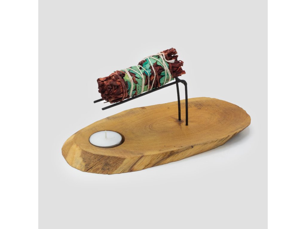 Praktický a estetický stojan na vykuřovadla ze dřeva s kovovým držákem. Ideální pro pomalé uvolňování vůní Palo Santa, bílé šalvěje nebo svazků bylin pomocí tepla čajové svíčky. Vhodný pro každodenní rituály, očistu prostoru i jemnou aromaterapii.