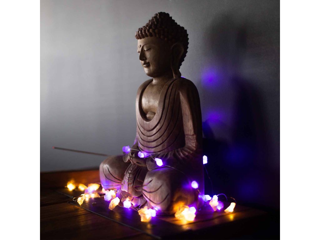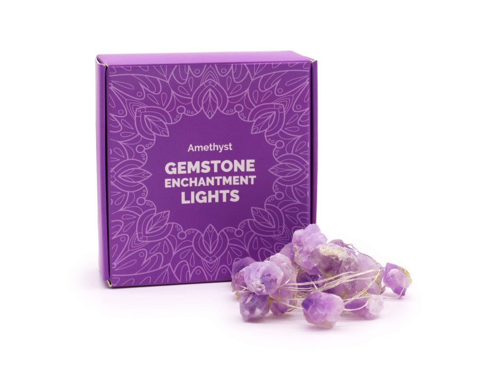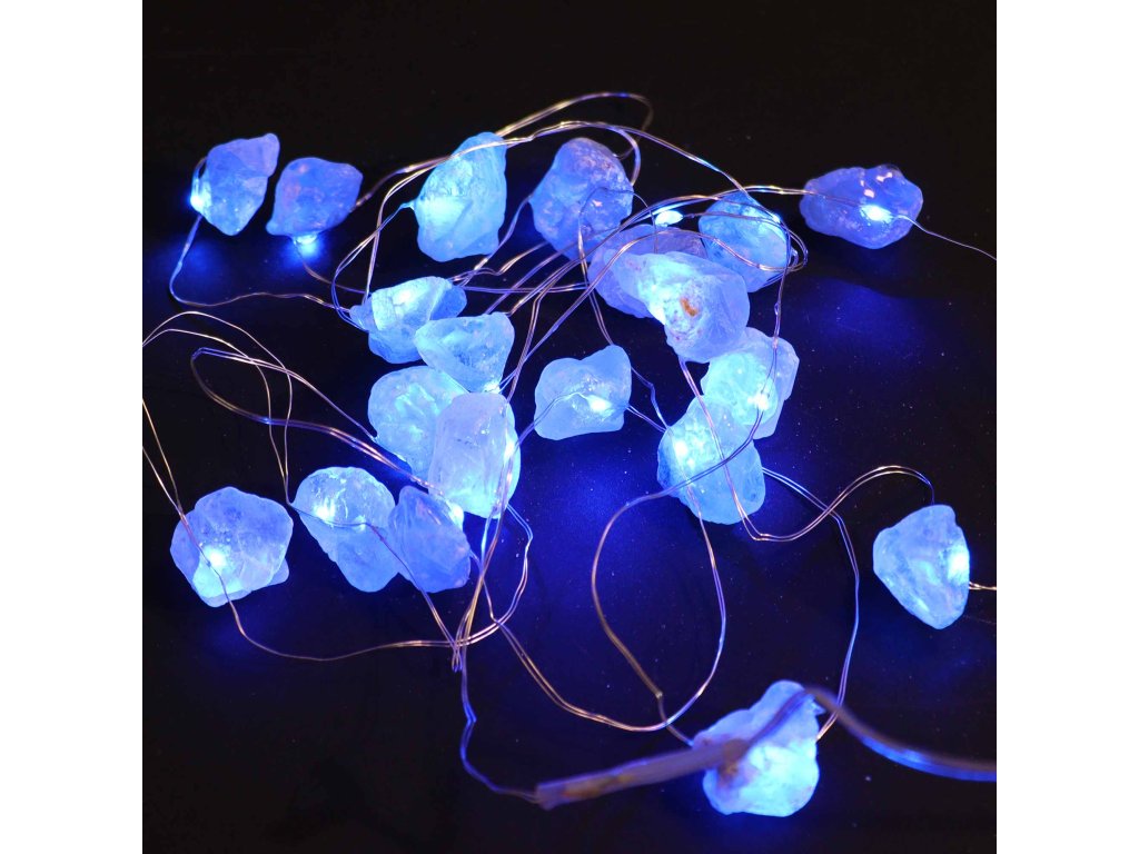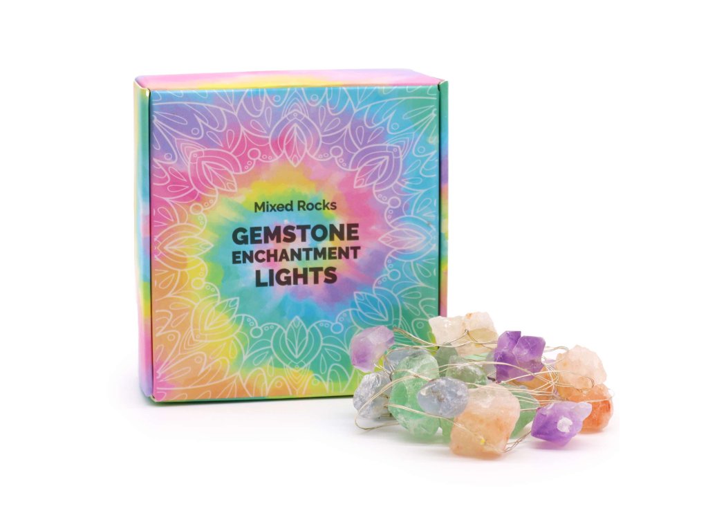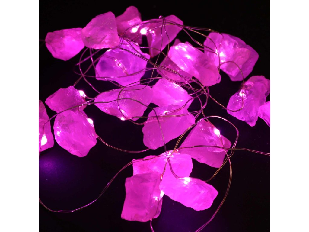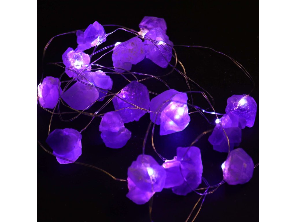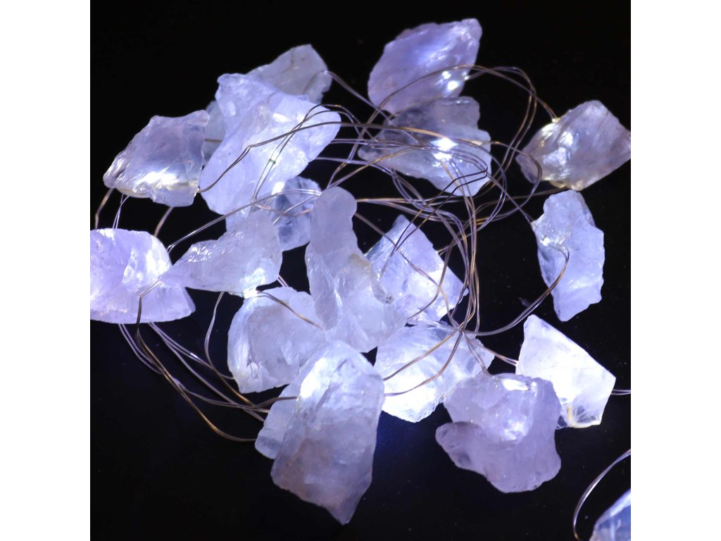 Nejedná se o obyčejný světelný řetěz. Každý kus je ručně tvořený a osazený skutečnými polodrahokamy, jejichž barvy a struktury se třpytí ve světle jako živé bytosti. Ametyst, růženín, aventurín, křišťál a další minerály vytvářejí jedinečný vizuální zážitek, kdy se světlo lomí a zrcadlí v jejich přirozené kresbě.