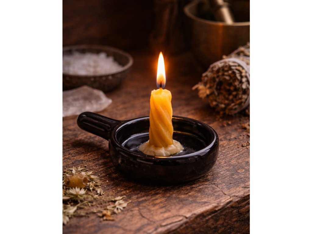 Díky svému tvaru je vhodný jak pro malé rituální svíčky ze včelího vosku i další šířky svíček až do 3,5 cm v průměru. Zvýšený okraj pomáhá zachytit případný vosk a udržet prostor čistý.